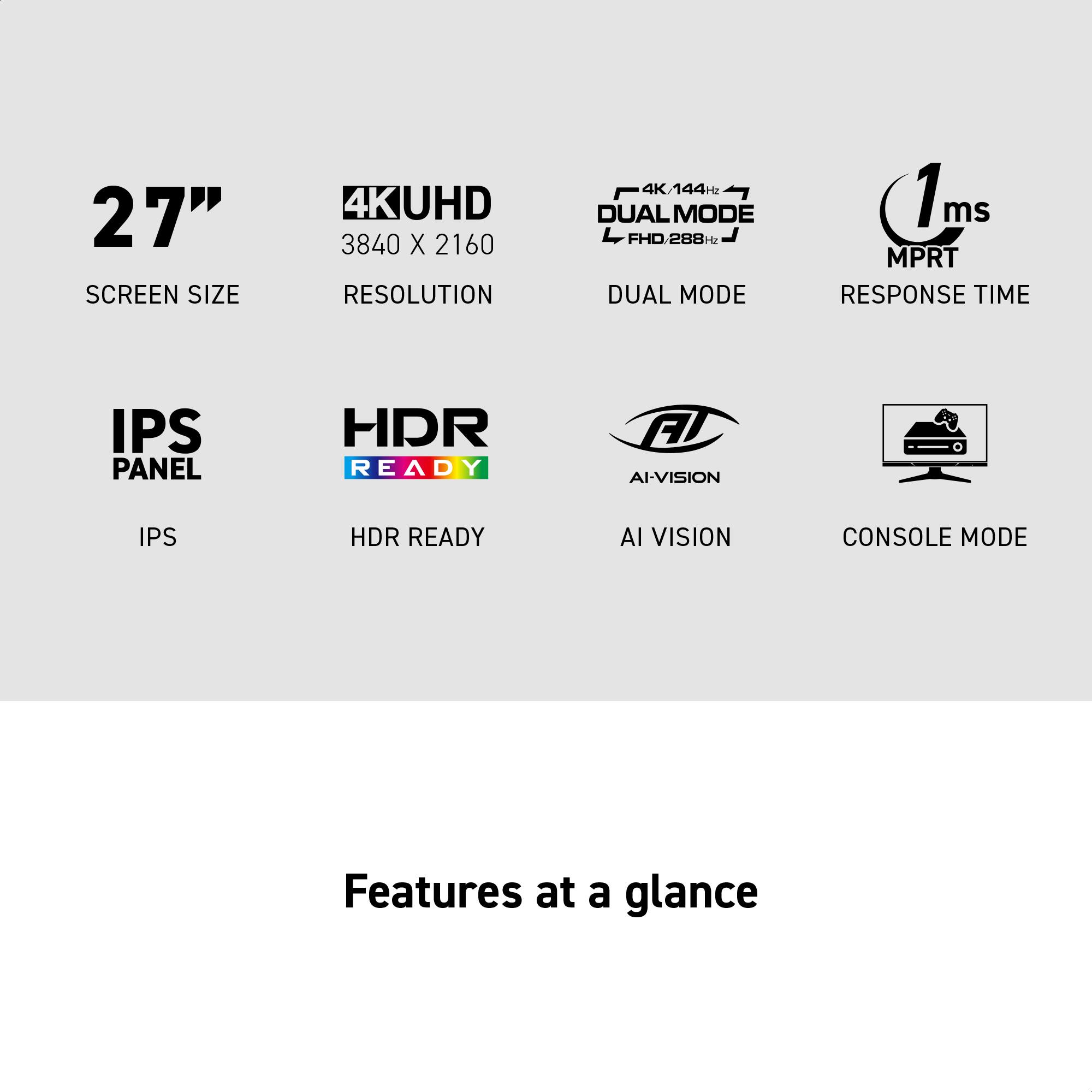 - Dual-mode operation with UHD 144Hz or FHD 288Hz refresh rates for customizable performance